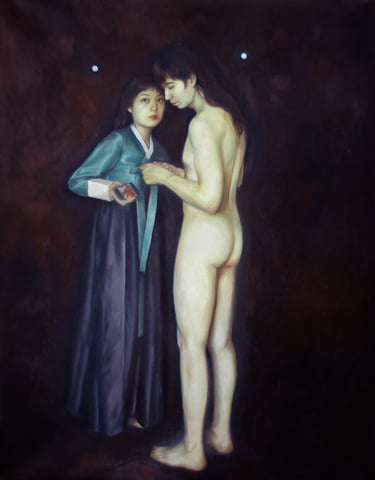 While the paintings engage with themes of diaspora, hybridity, and representation, they are, above all, a personal homage to the women in my life and our past selves. They are acts of care. Acts of recognition. And most of all, acts of refusal, to be simplified, categorized, or explained. Women of the diaspora who are not returning to something lost, nor assimilating into something foreign, but instead embodying something new through a mix of adaptation, improvisation, and inheritance.